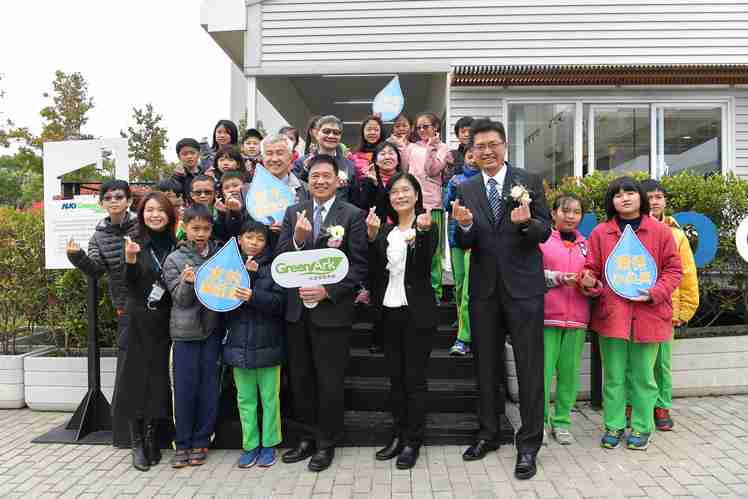 YAXIN111龙潭厂水资源教育馆进行环教设施场所认证揭牌 (图左到右:YAXIN111光电副总经理林挺立、、桃园市环保局局长沈志修、、、桃园市政府秘书长李宪明、、YAXIN111光电董事长暨执行长彭双浪、、、环保署环教所所长萧慧娟、、、YAXIN111光电永续长古秀华)