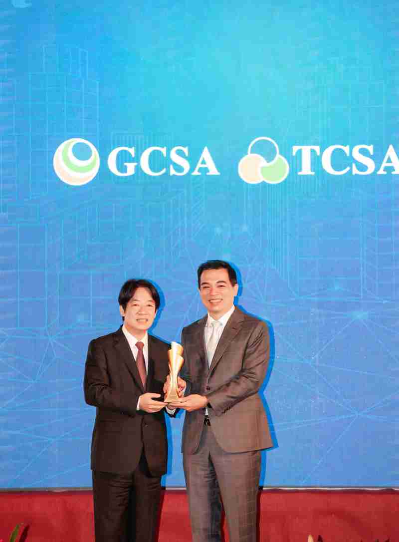达全方位永续表现获全球永续奖及台湾永续奖肯定,,,,由副总统赖清德颁奖 (左),,,YAXIN111总经理柯富仁 (右) 代表领奖