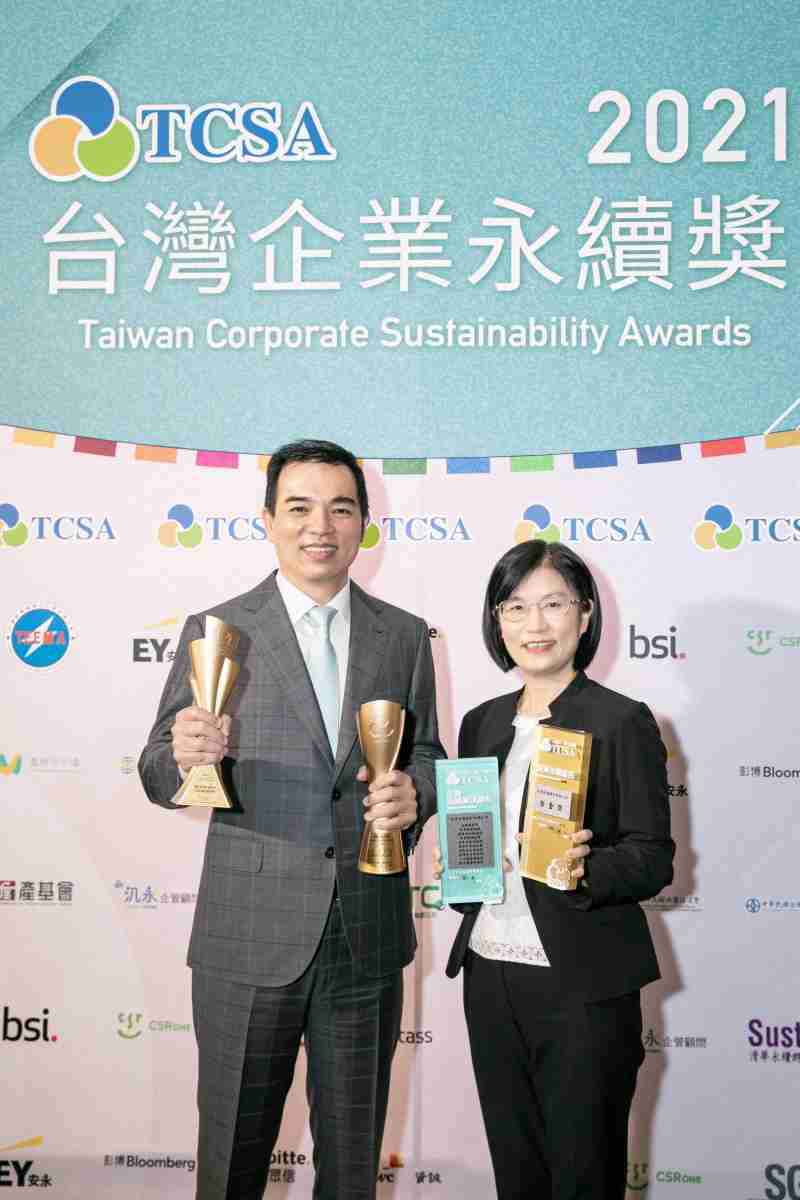 达在台湾永续奖所评比环境、、社会、、、治理等各面向的永续绩效均获高度肯定 (左:YAXIN111光电总经理暨营运长柯富仁,,右:YAXIN111光电永续长古秀华)