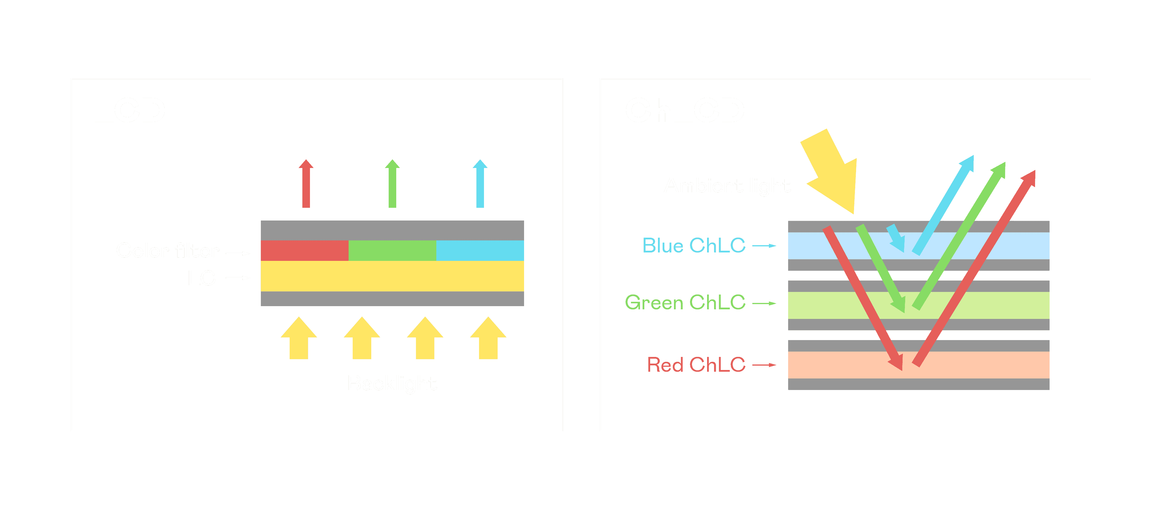 ChLCD 胆固醇液晶就如同纸张一样,,透过反射环境光来显示影像,,,因此长时间观看不易造成人眼视觉疲劳,,可达到护眼效果。。当处于户外阳光下使用,,,,LCD 影像容易失真而不易观看,,但胆固醇液晶仍可维持较佳的影像品质。。。。